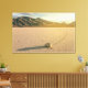 Bilden visar ett landskap av Racetrack Playa, ett torrt sjö i Dödsdalen, Kalifornien. Ett stort sten sitter på det krackade, torra yta och kastar en lång skugga. Bakom sten markerar en lindningslinje väg på spelaren. I bakgrunden är berg stiga upp mot ett himmel med spridda moln. Scenen har slagits i ett varmt, gyllene ljus och skapar en seren och mystisk atmosfär.