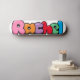 Namn Rachel i färglösa bubbelgummibrev. Färg kan ändras.