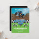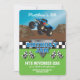 Personliga barn monster jam födelsedagsinbjudningar med en monstertruck, schackrutiga flaggdesigner och modern vit text som du kan anpassa för att passa din stil.