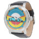 En färgrik och futuristisk sportbilsillustration med en blå kaross, röda accenter och en slående aerodynamisk design, åtföljd av en djärv gul båge över bakgrunden.