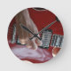 Räcka att leka den röda elektriska gitarren nära rund klocka
