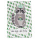 This delightful raccoon is ready for cold winter days with his green knit hat and favorite hot beverage. The background is a pattern of green holly with red berries. The text "cold days•hot drinks" can be personalized by adding your own text or a name.
