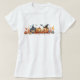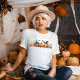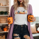 T-shirt med rad av pumpor . © Tees & Sweats på Zazzle. Denna halloween-tröja har en rad pumpor över bröstet med höstlöv och fladdermöss som flyger runt.