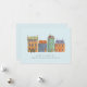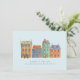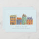 Semestervälkomstkort, en rad hus med juldekoration på en vinterdag