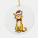 Katt av orange i en bukhinna och julhatt, lycklig som ska antas, på en keramisk prydnadsföremål som högtidlighåller den första jul i ett underhus. Text på baksidan kan ändras. AI-assisterad grafik som köpts med kommersiell licens. Bild: PaintPixelCo