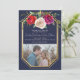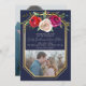 Det här sparar datum som är perfekt koordinerade med samlingen Radiant Blommigt bröllop. På framsidan finns blommor, rödblommor, plommon och ro-gräddblommor + en guld ram mot en marin blå bakgrund och ett foto av den framtida bruden och trimmen. Baksidan innehåller ytterligare ett foto. Kontakta mig om du vill ha hjälp med att anpassa det här datumet.