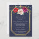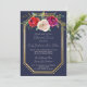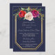 En underbar inbjudan till repetitionsmiddag i blommigt som innehåller blommor, rött, plommon och vattenfärg från ro och blommor i guld ram mot en marin blå bakgrund. Kontakta mig om du vill ha hjälp med att anpassa den här inbjudan till repetitionsmiddagen.