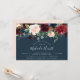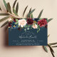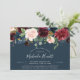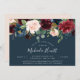 Chic blommigt inbjudningskort för möhippan har en översta gräns av burgundy marsala, rosa och marin blåa blommor, med lush botanical foliage och grey. Anpassa med din möhippa i moderna, vita, handskrivna skript och traditionella sans serif-bokstäver på rikens blå bakgrund som är perfekt för höst- eller vintermöhippor.
