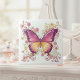 This vibrant ceramic tile features a stunning jewel-toned butterfly surrounded by swirling florals and delicate blossoms. Painted in rich shades of magenta, fuchsia, gold, and plum, the intricate detailing gives the artwork a luminous, almost stained-glass quality. Soft pastel greens in the background add a gentle glow that enhances the butterfly’s vivid wings and elegant curved accents.