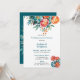 En levande och utförlig blommigt arrangemang som visar peonier i turkos, orange och teal nyans. Riken, skiktade petaler och ljuscentrum kompletteras med grönt löv och mindre orange blommar. Buketen är konstgjort sammansatt av blommorna som strålar ut utåt, framkallar elegans och harmoni.