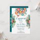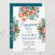 En levande och utförlig blommigt arrangemang som visar peonier i turkos, orange och teal nyans. Riken, skiktade petaler och ljuscentrum kompletteras med grönt löv och mindre orange blommar. Buketen är konstgjort sammansatt av blommorna som strålar ut utåt, framkallar elegans och harmoni.