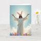 This card shows a robed figure in glowing white standing with arms outstretched, chin tilted upward as if meeting the light, and a radiant sunburst behind the head forming a soft halo. Tall, fluffy white bunny ears with pale pink interiors sit on top, adding a gentle, friendly touch 🐰. The scene is viewed from a low angle, so the figure rises against a wide blue sky where thin, feathery clouds drift by. In the foreground, smooth egg-shaped objects in pastel blue, pink, yellow, and purple nestle in fresh green grass, like small gifts placed close together 🌷. The robe’s flowing folds catch highlights and shadows, and the figure’s open posture suggests a welcoming bond, as though reaching out to someone just beyond the frame. A short line of text sits centered near the top in soft gold, with a smaller line near the bottom in light gray. The sunburst rays spread outward in pale yellow behind the head, while the pastel eggs cluster along the lower edge of the scene.