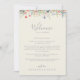 Det strålande bukblomman bröllop välkommen brev är perfekt för ett bröllop som ligger i norr. Utformningen har rosa, lila, , gult, marinblått, grönt löv och vild som är sammansatta i sömlösa och vackra blommigtar, som framkallar naturskönhet. Anpassa fronten med ett välkomstmeddelande till dina gäster och till namn. Anpassa baksidan med schemat för händelser och annan användbar information.