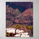 Ett foto av en stenbildning där träd växer ut ur ett sprickor. En liten observatör är placerad nära bildningens punkt och tittar ut på kanyon. Bakgrunden är en röd stenvägg som sjunker djupt ned i jorden, med spridda gröntar. Upphovsrätt ©2019 Kimberly J Tilley.