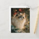 Celebrate the season with this enchanting feline portrait. A fluffy, blue-eyed cat sits nestled among snow-dusted pine branches and glowing string lights.