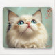 En nära porträtt av en Ragdoll kattunge med strejkande blå ögon. Katten har en fluffy, vit jacka och bär en svart halsduk med en blå gemstenscharm. Kattens ögon är öppet och fokuserat på något som inte är kamerabelt, skapar nyfikenhet och . Bakgrunden är en mjuk, pastellblå med delikata rosa-blommar som är spridda genom hela bilden och som lägger till en aning stollig och elegans i bilden.