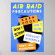 WWII-vintage teckning. Blått poster för Luft RAID-försiktighetsåtgärder. Det står till "behålla coola" "skrik inte" "inte springa", "förebygga oordning" och "följ alla instruktioner".