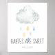 Den här regnmolnpojken spädbarn är söt och njut av ett renhetstecken är perfekt för en modern babydusch. Den söta och enkla designen har pastellteal, ljusblått, gult och vattenfärgade grått-regndroppar som faller från ett mjukt grått-moln.