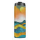 Abstrakt landskapsplats i ett bergsområde med rullande backe och en regnstorm i orange, guld, blått och cyan.