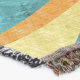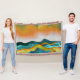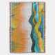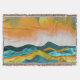 Abstrakt landskapsplats i ett bergsområde med rullande backe och en regnstorm i orange, guld, blått och cyan.