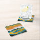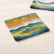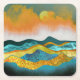 Abstrakt landskapsplats i ett bergsområde med rullande backe och en regnstorm i orange, guld, blått och cyan.