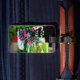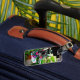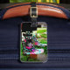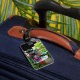 Bagagemärkre som presenterar ett foto av roliga & skraj rainboots.