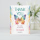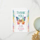 A beautiful watercolor butterfly thank you card featuring a vibrant rainbow butterfly surrounded by soft pastel splashes and delicate star accents. The playful yet elegant design is personalized with your child’s name and event date, making it the perfect way to thank guests after a magical first birthday celebration.