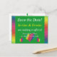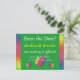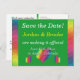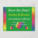 En enkel men ändå elegant utformning som placerar den viktiga informationsfronten och -centret i ett lättläst mode. Den gedigna bakgrunden som gränsar till ett stänk av regnbåge färg gör det svårt att förbise det här vykortet i brevlådan! Välj färg som du vill använda som bakgrund (visas här med grönt framtill och vit baktill). Baksidan är förformaterad både för returnerat och mottagande adress. Om du föredrar att lämna över din Spara datumen till adress, lämna bara det mottagande adress fält blankt. Använda den angivna mallen fält för att snabbt anpassa informationen. Klicka på "anpassa ytterligare" om du vill ändra teckensnitt, storlek, färg och positioner.