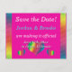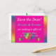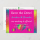 En enkel men ändå elegant utformning som placerar den viktiga informationsfronten och -centret i ett lättläst mode. Den gedigna bakgrunden som gränsar till ett stänk av regnbåge färg gör det svårt att förbise det här vykortet i brevlådan! Välj färg som du vill använda som bakgrund (visas här med shock rosa på framsidan och vit på baksidan). Baksidan är förformaterad både för returnerat och mottagande adress. Om du föredrar att lämna över din Spara datumen till adress, lämna bara det mottagande adress fält blankt. Använda den angivna mallen fält för att snabbt anpassa informationen. Klicka på "anpassa ytterligare" om du vill ändra teckensnitt, storlek, färg och positioner.