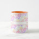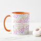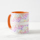 Den här roligten har två mönster som är kopplade till hjärtat. Det översta större mönster har ett färg-inbuktarhjärta och bakom är svarta konturerade hjärtan länkade till malltext på båda sidor av handtaget. Anpassa texten eller klicka på Anpassa för att välja det teckensnitt som du vill använda stil, storlekt och färg. Välj från en mängd mugg stilar för att passa din smak.