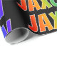 Den här multifärgade, roligt, vibrerande pappra designen har den gemensamma första namn-"JAXON" med ett färgstarkt regnbågsspektrum som färgning av mönster. Den har också en svart färgad. Att slå papper som det här kan vara ett roligt sätt att figurera en gåva eller gåva som ges till någon vid namn Jaxon. [~Z0000354]