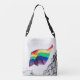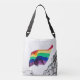 Detta är en underbar bild av pridets regnbåge som flyger med ett svart och vitt bild av byggnad i bakgrunden. Fin och stark symbol för pride.