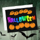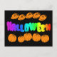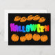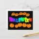 Lycklig Rainbow Halloween-vykort på svart bakgrund med regnbåge brev och orange pumpor.