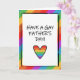 Ha en gay fars dag! Lycklig fars dag-kort för ditt homosexuella pappor med handskrivningsteckensnitt, ett regnbågfyllt hjärta och en regnbågsstripe bakgrund.