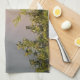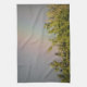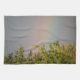 Kökshandduken i fantastisk har ett vackert landskapsfoto av en regnbåge över överdelen av lite träd. Fotografiet togs omedelbart efter en regnstorm för att fånga regnbågens levande färg. Omgivande himlar är grått med molntäcke.