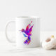 En färglös vattenfärgsdesign av en söt liten hummelfågel som innehåller hela regnbågens färg på dess silhuett på ett kaffe mugg.