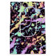 Retro 90s vibe of energetic graffiti splashes and a faux-holographic soft foil-y rainbow gradient.