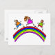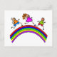 Tur tecknad vismisk illustration av en grupp av lycklig och olika små flickor och pojkar från stick figur som springer över en regnbåge. Anpassa enkelt och välj en egen bakgrund färg eller lägg till text. Bild finns tillgänglig på olika presenter och produkter.