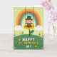 Designed with a cheerful St. Patrick’s Day scene, the card features a smiling leprechaun in a green top hat swinging from two brown ropes on the wide petals of a huge golden flower. He hugs a pot spilling with gold coins, and his bright grin gives the moment a friendly, inviting feel 💚. A soft rainbow arcs across a pale green sky behind him, adding a gentle glow to the background 🌈. Two fluffy white clouds float on either side, balancing the scene and framing the leprechaun like quiet companions. Below, rolling green hills stretch across the foreground with small yellow flowers and a few simple sprigs of foliage. The message “HAPPY ST. PATRICK’S DAY” sits prominently in the design in friendly, thick lettering, standing out clearly against the light sky. Tiny white specks, like little blossoms or stars, are scattered near the top of the card.