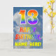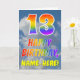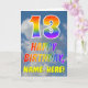 Den här roligten och den färgstarka 13:e födelsedagskalenderns hälsningskort visar en grumlig blå himmel, tillsammans med ett stort nummer "13" och meddelandet "GRATTIS PÅ FÖDELSEDAGEN", som har en regnbågsinspirerad färgtoning av mönster på framsidan. På framsidan finns också personligen namn på kortets mottagare. Insidan innehåller ett anpassat hälsning-födelsedagsmeddelande eller kan kanske tas bort och lämnas tomt om ett meddelande ska skrivas för hand i stället. Ett födelsedagskort som detta kan vara ett roligt för att skicka önskemål till någon som firar sin trettonde födelsedag. [~Z0000371]