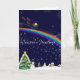 Julscenen med Julgran, snögubbe och hus i bakgrunden, och tomten flyger över regnbågen mot natten himmel. Unika och vackra illustrationer för julkort.