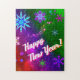 Vänner och familj i ge ett unikt nytt år hälsning med detta 11 x 14-tums pussel med en bild av söt blå, fuchsia och grönt snöflingor på en regnbåge i helgdag. Vit helgdag. Se hela nyårspussen under HEMMA-kategorin i avsnittet HELGDAGAR.
