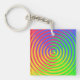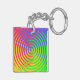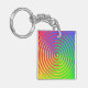 Här är en färglös akrylnyckelkedja med en abstrakt spiral-regnbåge mönster som snurrar runt ett centralt mål i färg av grönt, blått, gult, orange och rött.