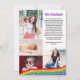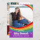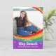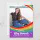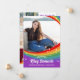 Regnbågtemat studenten meddelande tryckt med ditt student-foto i ett tryckt regnbåge ram med vita gnistor i ett skämtsamt stil. Lägg till deras namn i ett retroskript. På baksidan kan du ladda upp ytterligare fyra foton från student, kanske från olika åldrar i deras liv, tillsammans med ett om student där du kan prestationer eller där de planerar att studera härnäst eller vad de planerar att göra härnäst. En färgstark perfekt för ett studenten-annonskort för en HBT TQ-student!