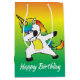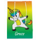 Grattis på födelsedagen Rainbow Unicorns gör dadden på ena sidan av väskan och dansar på den andra. Anpassa texten "Grattis på födelsedagen" och "Namn" med ditt eget meddelande.