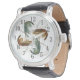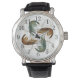 Ur med fyra räkor design på urtavlan. Vit bakgrund och numrerad runt om i svart, räkorna är gröna och bruna färger och har långa, virvlande antenner som lägger till intresse för designen. Tillverkad som ett herrur, och är perfekt för en saltvattensfiskare eller ägare av en betesaffär, men fungerar också för kvinnor eller barn.