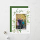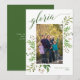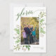 En grön och vit festlig fotokort, med ditt favoritporträtt i en ram av gröna vattenfärgblad och bär, med "gloria" i matchande mörkgrön modern kalligrafisk stil. Personifiera ytterligare med ditt familjenamn och år. Baksidan är i mörkgrönt, med bibelversen “Ära åt Gud i höjden, och på jorden frid och välbehag bland människor!” Lukas 2:14, som du kan redigera.