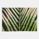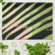 Den strimlade tropiska mönster på detta kökshandduk tillverkades av ett originalfoto av ZoeSPEAK från en handflatan royal i solsken, mot en mörk grönt bakgrund av gräs träd. Kontrasten är stark mellan mörkens bakgrund och gultens grönt löv med laxens rosa och skapar att denna abstrakta design från naturen nästan ser ut som ett djurtryck.