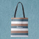 Tycker du om söt tote bags? Den här väskan har en mönster av mocha brun, teal och vit rand. Namn kan ändras och personligen anpassas efter dina behov!