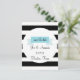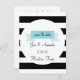 Detta "spara datum"-postkort har en blå banderolldesign på en svart-vitrandig bakgrund. Anpassa detta postkort med dina detaljer och en speciell hälsning på baksidan.